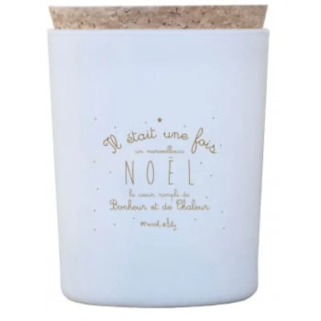 Elle est dotée d'un contenant en verre laqué blanc qui donnera une touche d'élégance à n'importe quel intérieur. Le couvercle en liège 100% écologique préserve le parfum de la bougie lorsque celle-ci n'est pas utilisée. Le message "Il était une fois un merveilleux Noël, le cœur rempli de bonheur et de chaleur" est sérigraphié en doré sur la bougie, ajoutant une touche sentimentale à ce produit.