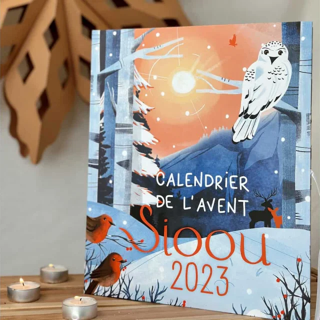 Le Calendrier de l'avent Sioou édition 2023 se distingue par son design unique. Cette année, le noir a été remplacé par des couleurs plus douces et chaleureuses. Il se compose de bleu, de blanc et d'orange pour créer une ambiance hivernale douce et chaleureuse.