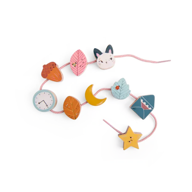 Les 14 perles multicolores de ce jeu d'enfilage prennent vie grâce à la créativité de votre enfant. Chaque perle est délicatement illustrée avec des motifs inspirés de la collection "Après la pluie", pensée par la talentueuse Lucille Michieli. Cette collection évoque un univers doux et poétique, où les créatures enchantées émergent après une averse, entourées par la douceur de la nature.