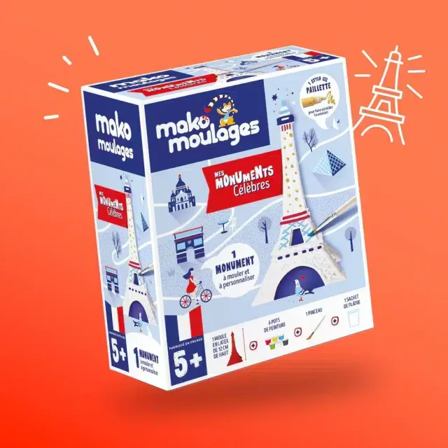 Chaque kit est conçu pour offrir une activité manuelle complète, où l'on peut créer sa propre figurine de A à Z. Il contient un moule en latex Tour Eiffel, un sachet de 150g de plâtre, 6 pots de peinture de différentes couleurs, 4 croisillons, un pinceau et une notice de jeu. Les dimensions du kit sont : 150 x 80 x 180 mm, et son poids est de 430g. En outre, tous les composants du kit Mako Moulages sont fabriqués en France, gage de qualité et de durabilité.