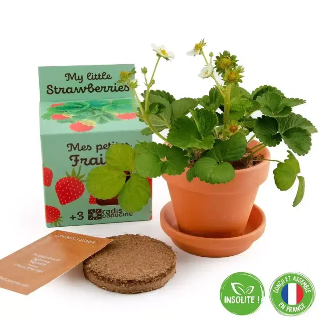 Le kit de jardinage comprend un pot de terre cuite de 5 cm de diamètre, une pastille de terre de coco de 3 cm de diamètre, ainsi qu'un sachet de semences de fraisiers des bois mignonette. Assemblé dans leur atelier de production près d'Angers, ce produit allie performance et durabilité.
