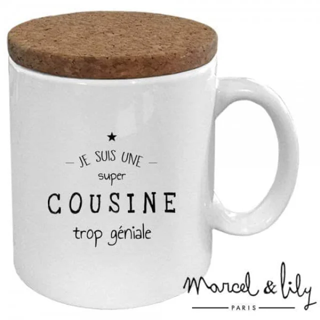 Mug en céramique " Cousine trop géniale " avec son couvercle en liège 100% écologique et fabriqué dans le sud ouest de la France pour garder les boissons bien au chaud ou pour s'en servir de sous tasse.
