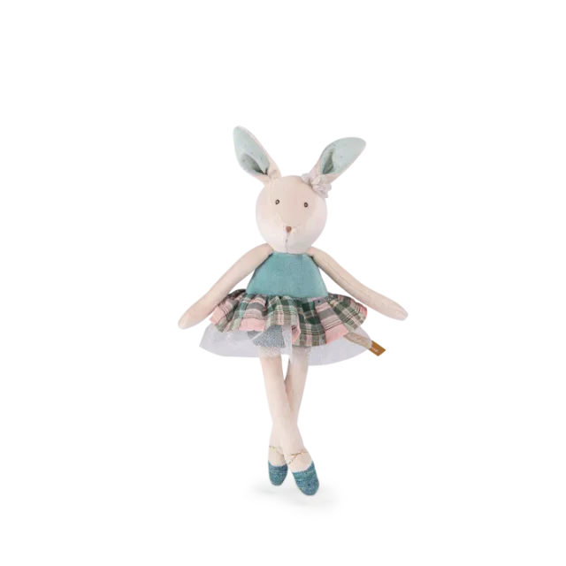 La petite peluche Lapin bleu - Moulin Roty est une poupée de chiffon de haute qualité avec un visage doux, brodé soigneusement. Elle dispose d'un charmant tutu à carreaux, de petits chaussons de danse et d'un élégant nœud sur la tête. Facile à saisir par les petites mains, ce doudou lapin deviendra le compagnon préféré de votre bébé en un rien de temps.